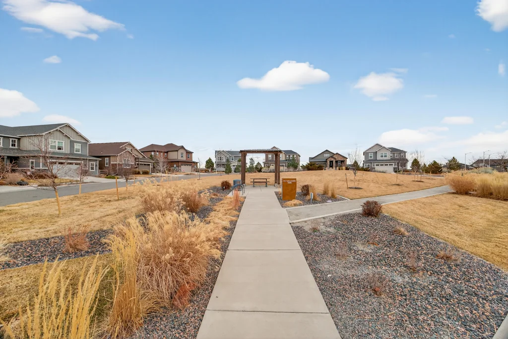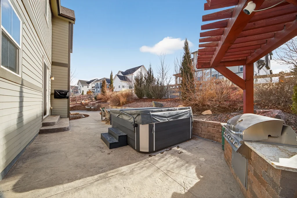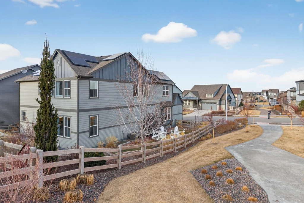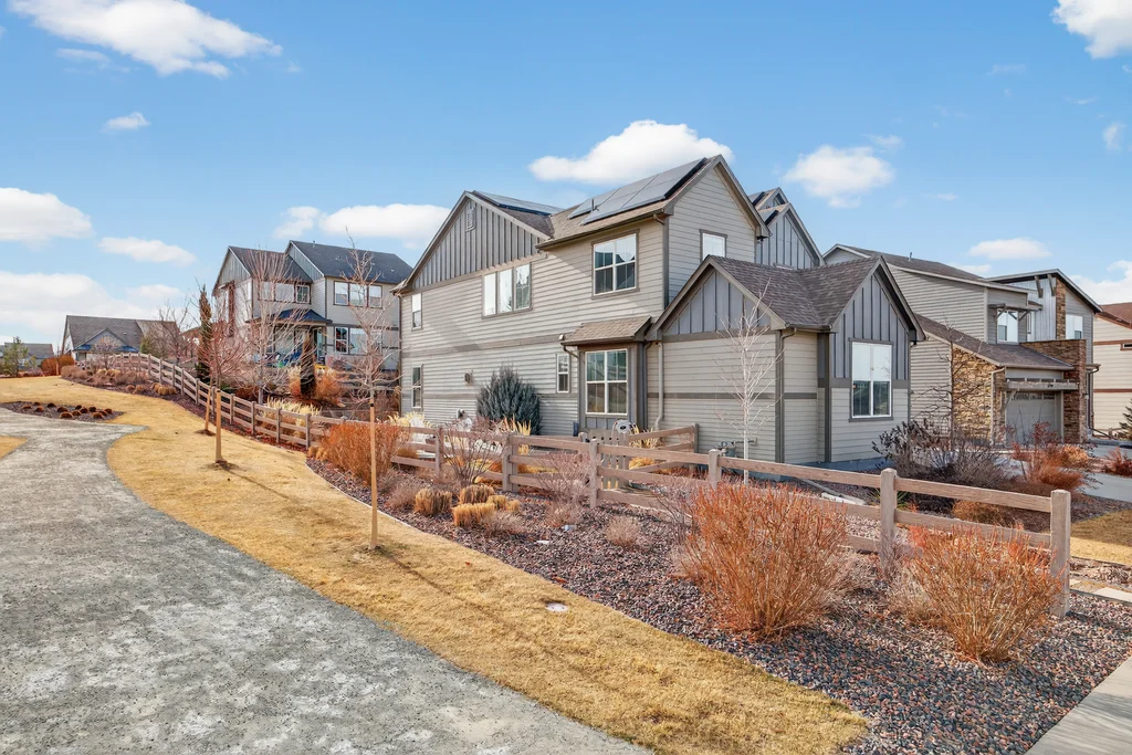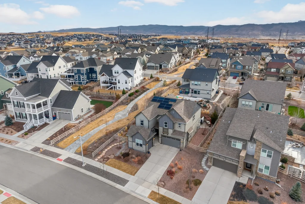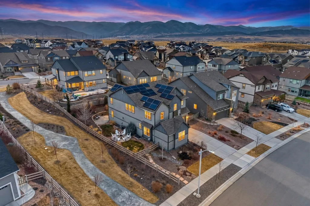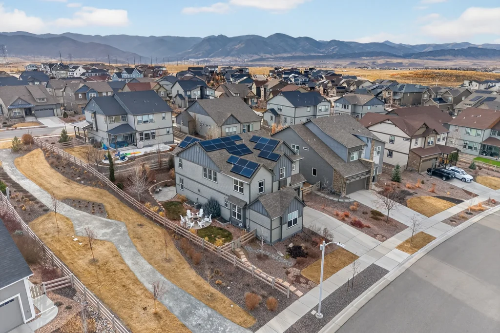 Set against the scenic foothills, this thoughtfully designed Sterling Ranch home blends modern comfort, smart technology, seller owned solar/Powerwalls, and elevated outdoor living, all perfectly positioned beside a community path and a short stroll to a neighborhood park. Step inside to soaring ceilings, expansive windows, and a bright, contemporary layout designed for everyday ease and entertaining alike. The main level features a dedicated office, generous dining area, and great room with built-in surround sound anchored by a gas fireplace. The kitchen is both stylish and functional with premium appliances, upgraded quartz counters, a massive center island, walk-in pantry, and an additional pocket office. A wide sliding door opens to the patio, creating a seamless indoor outdoor flow. Upstairs, four bedrooms provide flexibility and privacy, including three with ensuite baths. The spacious primary suite feels like a retreat, filled with natural light and complemented by a spa inspired bathroom with soaking tub, frameless glass shower, and an oversized walk-in closet. A large laundry room adds everyday convenience. The unfinished basement with 9’ tall ceilings and oversized windows offers excellent potential for future living space. The backyard is designed to impress, featuring professional landscaping with uplighting, stamped concrete patio, stone accents, built in grill station with pergola, multiple seating areas, high end Artesian Elite spa and a custom gas fire pit perfect for Colorado evenings. Energy efficiency is exceptional with a seller owned solar system, three Tesla Powerwalls, and Tesla EV charger. The home achieved a 92% solar offset in 2025 while running two AC units, resulting in an average electric bill under $25 per month. Sterling Ranch residents enjoy access to parks, trails, recreation facilities, community pool, and neighborhood dining and coffee spots just minutes away, creating a lifestyle that feels both active and connected.